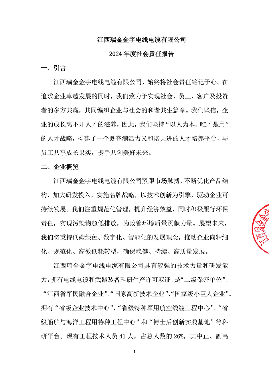 江西瑞金金字电线电缆有限公司2024 年度社会责任报告